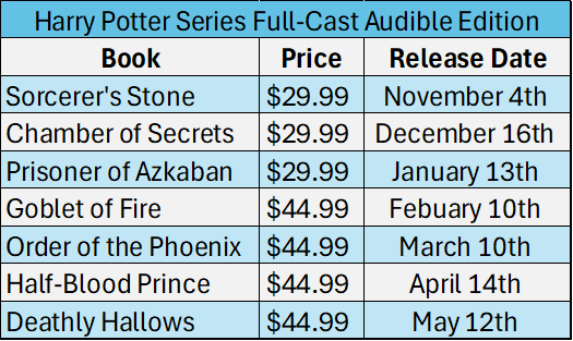 Pottermore Publishing is teaming up with Audible for a new collection of audiobooks releasing this November! This will be an Amazon Audible exclusive and will feature a full-cast reading of the series. The series will drop monthly, with “Harry Potter and the Sorcerer’s Stone” available on November 4th and “Harry Potter and the Chamber of Secrets” on December 16th. All other audiobooks will be released next year between January and May. Books one through three will cost $29.99, while books four through seven will cost $44.99. The series will also be included with an Audible membership, which costs $14.95 per month.