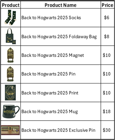 The Harry Potter Shop has unveiled a new collection, dedicated to the Back to Hogwarts Celebration on September 1st, featuring seven new items. From least to most expensive, there’s the Back to Hogwarts 2025 socks at $6.00, the foldaway bag at $8.00, the 2025 pin, print, and magnet, each at $10.00, the mug at $18.00, and the exclusive pin at $30.00. The exclusive pin is currently sold out.