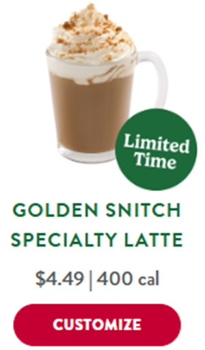 Wash down your sweet treats with the Golden Snitch Latte, a caramel toffee latte topped with whipped cream, cookie crumble, and sugar. Choose from the Iced, Frozen, or Hot Golden Snitch Specialty Latte, each priced at $4.49.