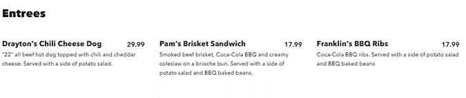 Leatherface’s BBQ will serve beer, cocktails, hard seltzer, and three entrees: Drayton’s Chili Cheese Dog, Pam’s Brisket Sandwich, and Franklin’s BBQ Ribs. Alcoholic drinks will cost between $13.00 and $18.00. Pam’s Brisket Sandwich and Franklin’s BBQ Ribs are both $17.99, while Drayton’s Chili Cheese Dog is $29.99. Non-alcoholic beverages and chips are each $6.00 or less.