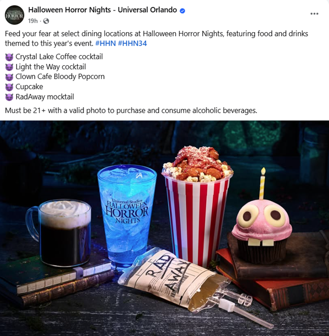 Over on the East Coast, Universal Orlando released its first look at the food and drink slate for this year’s event. Unlike Hollywood, Orlando has not updated its dining options on their respective site at this time. From a post by Halloween Horror Nights – Universal Orlando, we have a sneak peek: the Clown Café Bloody Popcorn, Crystal Lake Coffee cocktail, Cupcake, Light the Way cocktail, and RadAway Mocktail. Universal Orlando Resort also replied to a question regarding maps, stating that they “do not have this information available at this time”. This is not uncommon, as they did not release an official map last year until the week of the event.