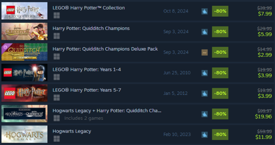 Steam is practically giving away its copies of all Harry Potter games on the platform. Hogwarts Legacy, Harry Potter: Quidditch Champions, and LEGO Harry Potter are all 80% off. This includes most collections and packs. The Hogwarts Legacy + Harry Potter: Quidditch Champions Deluxe Editions bundle, Harry Potter: Quidditch Champions Deluxe Pack, Hogwarts Legacy: Dark Arts Pack, and LEGO Harry Potter Collection are all also 80% off. Steam’s Back to Hogwarts sale ends on September 2nd.