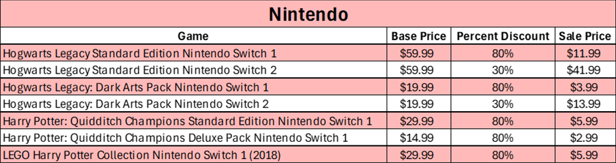 Nintendo is offering various sales on Harry Potter games through September 3rd. Hogwarts Legacy, Hogwarts Legacy: Dark Arts Pack, Harry Potter: Quidditch Champions, Harry Potter: Quidditch Champions Deluxe Pack, and the LEGO Harry Potter Collection are all 80% off for the Nintendo Switch 1. The Nintendo Switch 2 only offers a 30% discount on Hogwarts Legacy and its Dark Arts Pack.