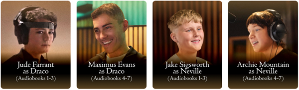 Audible’s Draco, Neville, and Luna have found their voices as well. Jude Farrant and Maximus Evans will play Draco. Farrant will record audiobooks one through three, and Evans will complete audiobooks four through seven. Similarly, Jake Sigsworth and Archie Mountain will also share Neville. Sigsworth will portray Neville in books one through three, and Mountain will voice books four through seven. Luna, however, will only be voiced by one actress, Millie Gubby.