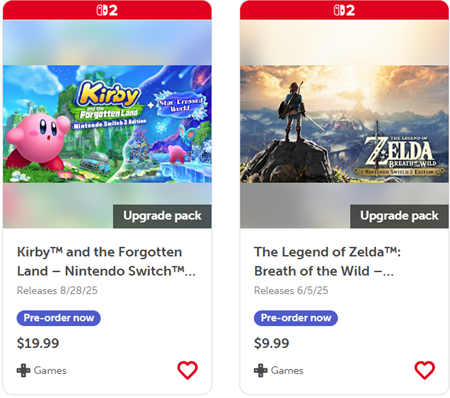 Numerous other Nintendo Switch games will also have upgrade packs for varying prices. Several games, such as Super Mario Odyssey and Pokémon: Scarlet, will have free updates for the Nintendo Switch 2. Other games, such as Hogwarts Legacy, The Legend of Zelda – Breath of the Wild, and Kirby and the Forgotten Land, will have upgrade packs ranging from $9.99 to $19.99.