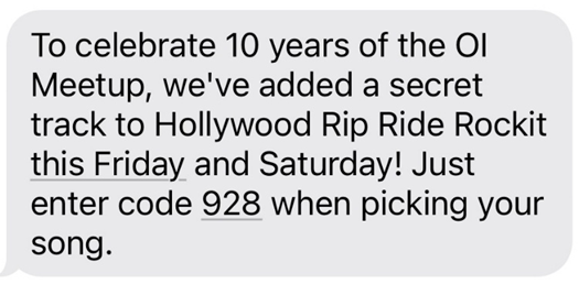 In celebration of Orlando Informer’s 10 years of meetups, a secret song track will be added to Rip Ride Rockit this Friday, June 6th, and Saturday, June 7th, if code 928 is entered.